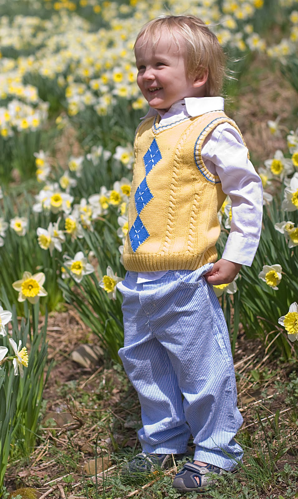 On the Saturday before Easter we were thinking about going to a local nursery for an Easter egg hunt. When I visited the nursery\’s website I saw a post about daffodils being in bloom at a local arboretum. OK, not so crazy about easter egg hunting with 20 or more other kids, we decided to head to the Reeves-Reed Arboretum. It was a beautiful, peaceful spot and the daffodils were definitely in bloom. We went at high noon so my pictures didn\’t turn out great, but Q still looks very cute. Oh, the poor guy in his \’monkey suit\’. Grandparents! You better enjoy this because this is for you 😉