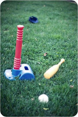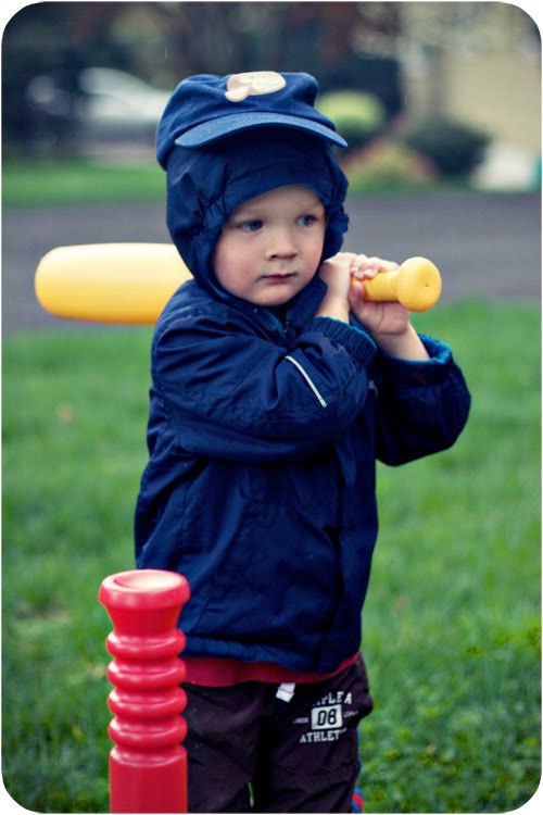 We had a bit of a rainy, cool day today and spent most of the day inside. We had MyGym in the morning, came home and had lunch, played with Play Dough, and made Chocolate Chip Oatmeal Cookies. Around 4:00 pm Quinn put on his monkey hat and decided he wanted to play baseball. You may remember this post where Quinn put on his \”monkey hat\” to play baseball with Don. Now when Q puts on his hat, it\’s time for baseball. What\’s a mama to do? Play baseball!