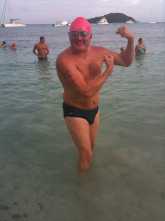 St. John hosts a beach-to-beach Power Swim every year over Memorial Day Weekend. Don saw the notice and decided to enter at the last minute. There are a bunch of different swims you can do, but basically it's a 1 mile, 2+ mile, or a 3+ mile. There is an 'assisted' category for each length where you can use fins and snorkel.