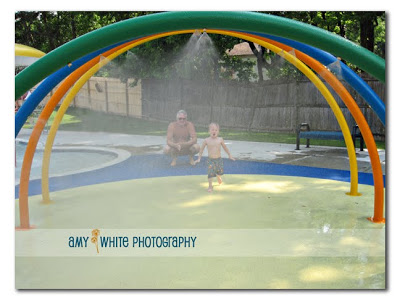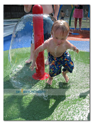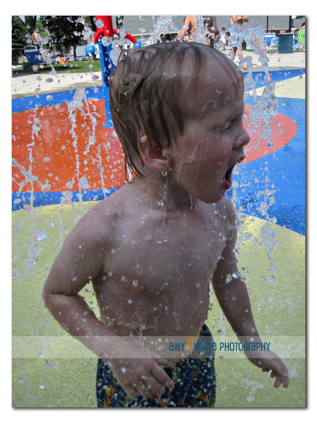 Summer is here so it must be time to go to the Westfield Pool! The weather was looking a little iffy but we decided to brave the elements and head to the pool. It turned out to be a warm and sunny day. The pool water was still on the chilly side and we saw lots of kids with blue lips and the shivers — including our own. We had to take a couple of breaks to wrap him in a towel and warm him up. Quinn started off a little tentatively but then jumped right in to the fun. You might remember that our local pool has a very large sprayground and two big kiddie pools.