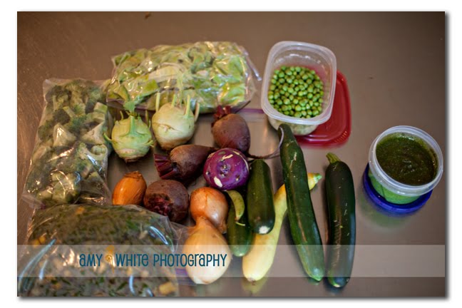 Don and I participated in a CSA in Seattle and I found it easiest to break everything down the day you get it, if possible. So all the greens got washed, chopped and bagged. Tops were cut off, veggies were washed and broccoli was cut in to florets. I also shelled and cooked the peas, which we munched on during dinner, and made pesto out of the basil. See….