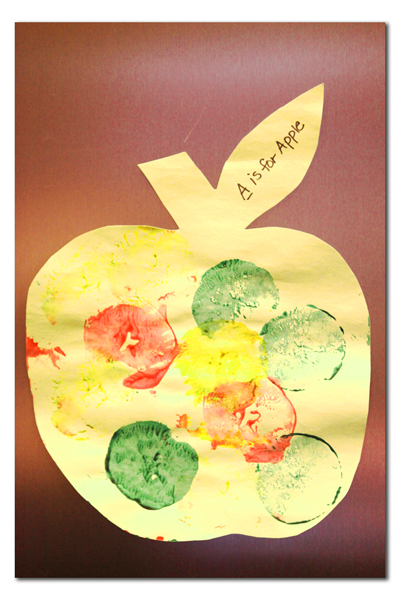 Each week, the whole school learns/concentrates on one letter in the alphabet. As you can see, \’A\’ was the letter this week. They used apples that were cut in half to make this piece of art.