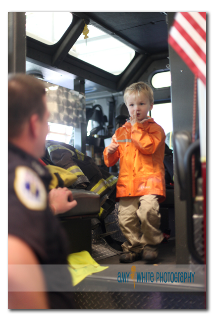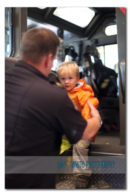 The kids got the chance to walk through the front of the fire truck. Quinn\’s not so sure about getting a help out.