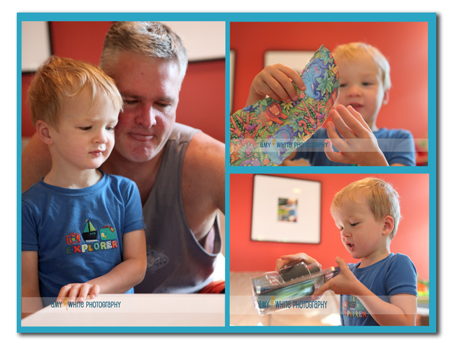 You can see Papa doing some serious thinking while helping out Quinn. Wow binoculars from Aunt Pam! Quinn is a big fan of binoculars!