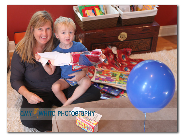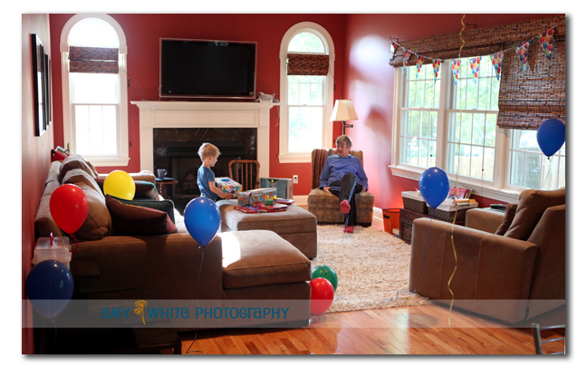 The birthday festivities started on Friday and continued in to Saturday. You can see the family room decorated for Quinn\’s birthday. The dozen plus balloons had started their quick descent but the room was still festive. Saturday morning Quinn woke up ready to open his gifts.