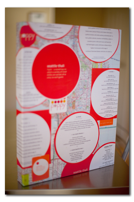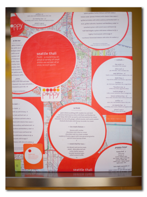 One of Don and my favorite restaurants in Seattle was a place called Poppy. They serve Indian inspired Thali which is a bunch of little dishes of yummy food. It was great because the food was spectacular and we felt comfortable taking Quinn with us. For our Seattle inspired wall, I got this crazy idea of including menus of our favorite Seattle restaurants. Poppy happened to be the only one that came to the rescue and sent us a bunch of menus, business cards, and fun stuff. I took their menus, a Seattle road map, a blank stretched canvas, mod podge and made this…