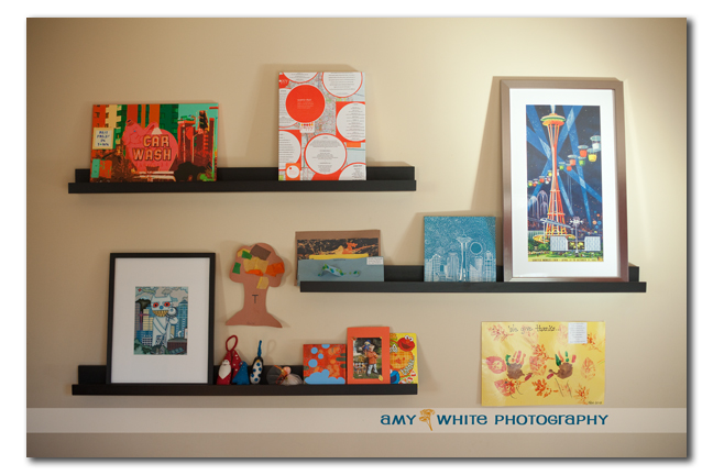 I decided to put some art up on the empty wall in our kitchen across from the kitchen table. I played around with a bunch of ideas before my good friend Joanne Taylor recommended a great idea of putting up shelves. This way we could interchange our \’art\’ and make it a seasonal display. Our inspiration for this wall was Seattle and you can see that it is not so subtle.