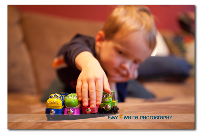 Here\’s Quinn with some of the trains Papa found for him.