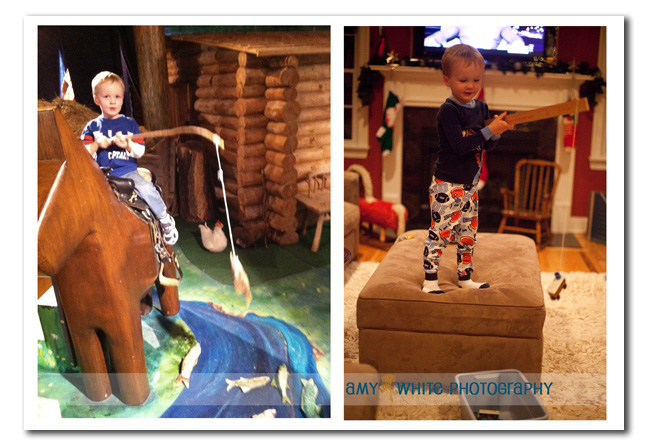 Quinn loved climbing up on this horse and fishing. Quinn has seen people fish before and has talked about fishing himself. As you might imagine that as vegetarians we\’re not crazy about the concept. But we agreed that he could play fish as long as he threw them back 😉 Don even set up a fishing pole, a bucket, and trains to fish for at our house.