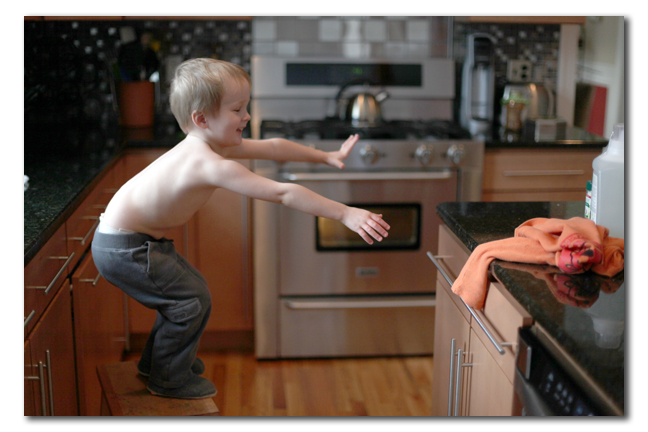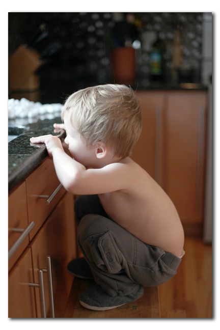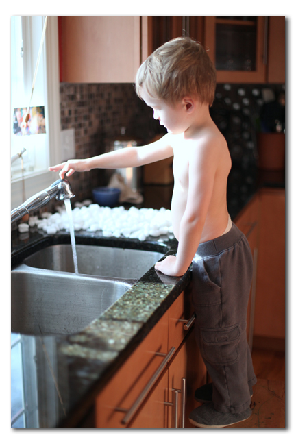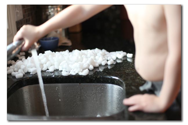 After a week apart, our little family enjoyed a day hanging around the house. Don and Quinn played lots of silly games and there was much laughter and giggling. We received some packages with the dis-solvable peanuts so Don set up Quinn at the sink to have some fun.