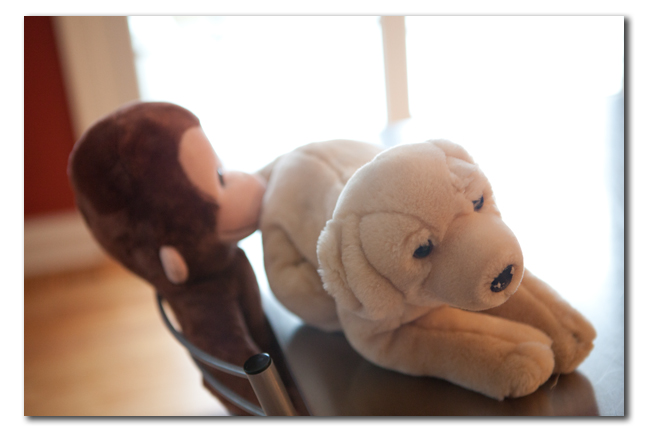 We got home to find this scene. What is up with Curious George sniffing The Buddy\’s butt? The Buddy looks a little sad about it. Don says they were just doing a proper greeting. Disturbing!