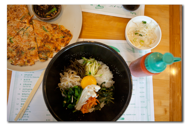 We started with banchan, which are free little side dishes that are always different. We got kimchee, beansprouts, a spicy salad, and a fishy thing. We also ordered a vegetable pancake that is made with veggies and kimchee. One of our favorites. I got the Bi Bim Bop which was served in a sizzling stone bowl with hot rice, cold marinated veggies, and a raw egg yolk that cooked in the hot food. You can see our pancake and my Bi Bim Bop in this picture. Don got a spicy kimchee soft tofu stew which came out sizzling and bubbling like crazy. As Rachel Ray would say: Yum-O!
