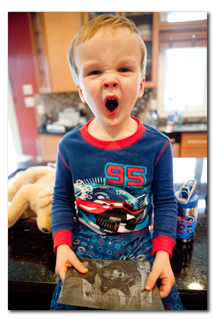 Saturday. \”The Boy\” has had a bit of a cough and it kicked in full force on Saturday. He woke himself coughing early on Saturday morning. This is what he looked like by 10 am. Yaaaawing. He had just opened a card from Mae and he thought it was funny that in the picture the wolf had snow on his nose.