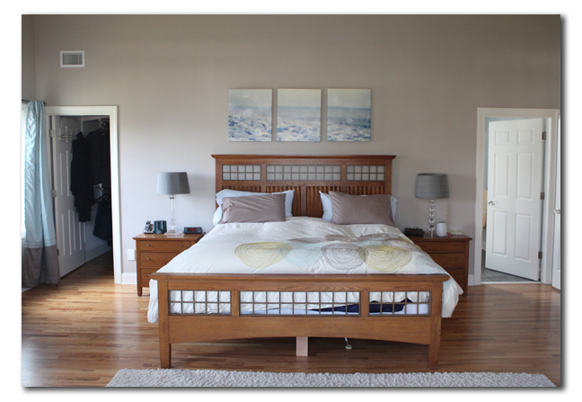 In the first picture you can see a peak in to the bathroom. It\’s painted a grayish blue to accent the colors in the bedroom. And there you have it. Our bedroom makeover.