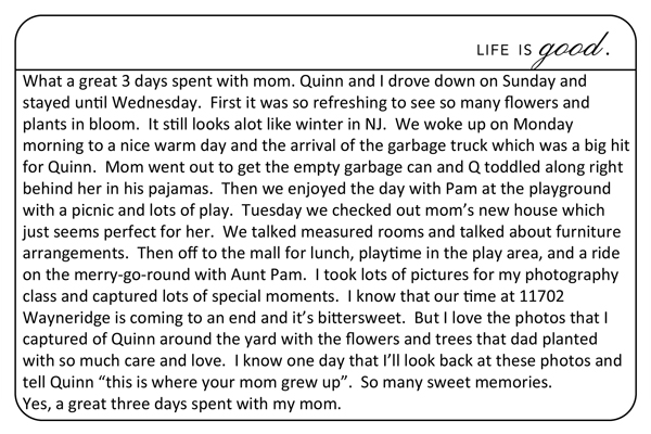 Three Great Days with Mom Published on April 7, 2011 by amyewhitelivecom Share this: Share on X (Opens in new window) X Share on Facebook (Opens in new window) Facebook Like Loading... Related