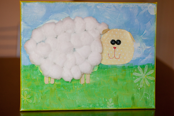 We took a break and then worked on the green grass, transferred some flowers on to the painting, glued on white fluffy cotton balls, added popsicle sticks for legs, toy tires for eyes, I put on some finishing touches, and then we mod podged the whole thing. Here\’s our creation.