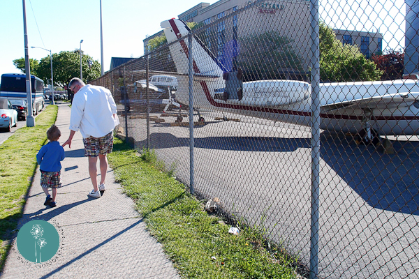 We are very lucky to have Mae visiting for the week and had an extra special treat when we also got to see Brad. Brad was in NY for the week training and had a brief break before he had to fly to his next training destination. We picked him up at his hotel near La Guardia airport. We had a couple of extra minutes to checkout the airplanes in the near by parking lot. Notice the cute father-son shorts 🙂