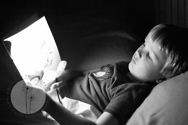 He was laying quietly in bed in the dark bedroom reading Cat in the Hat with my little book light.