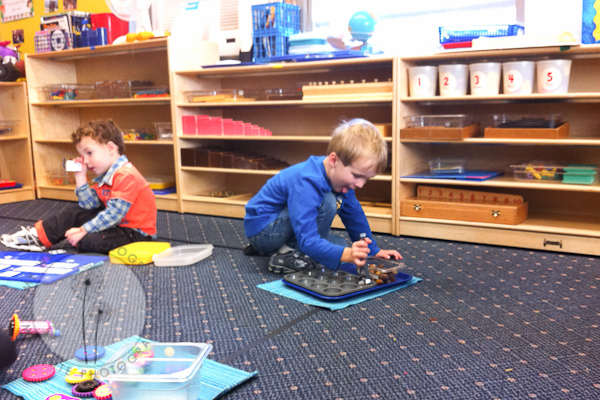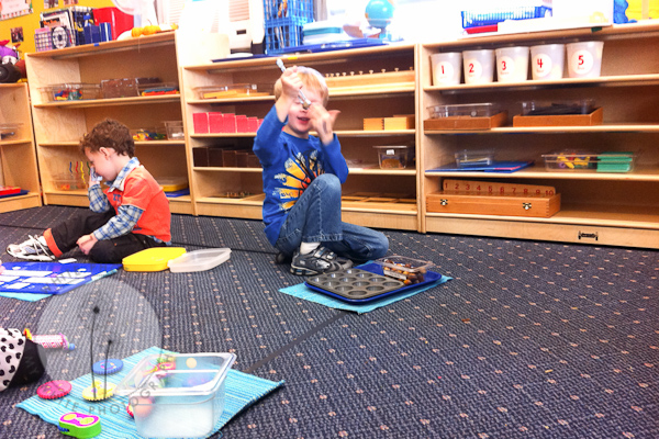 If you\’re familiar with Montessori, you can see some Montessori touches in the classroom. Each child pulls out to mat to work on and they can choose an activity off the shelf or go to one of the tables with a teacher.