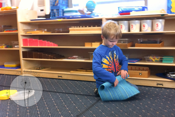 Quinn finished his activity, rolled up his mat, and put it away. Hmmm, now why won\’t he do that with his toys at home?