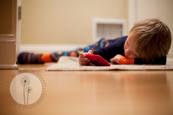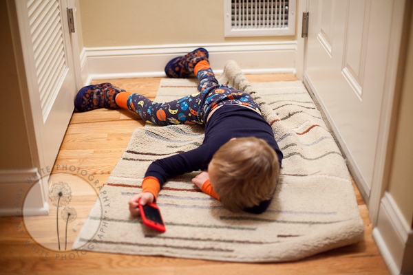 Quinn often finds unique places to hide and watch his video. You can often find him under a kitchen stool or under the kitchen table. In this case, he decided to lie down in the alcove by the door to the garage to watch a video. I\’m not sure how much time had passed before Don and I noticed it was pretty quiet over there. He was sound asleep at 7 pm.