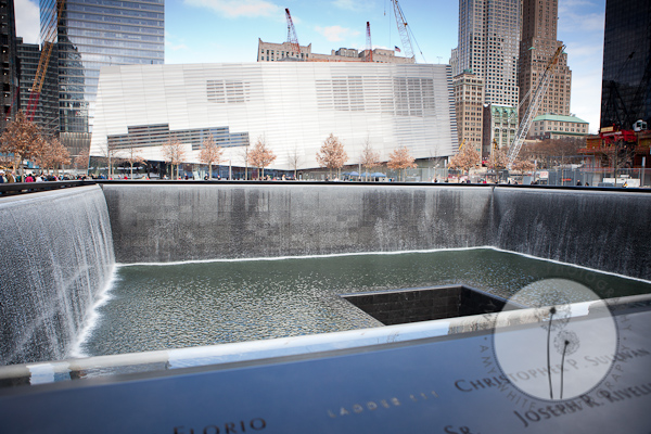 This is the South Memorial Pool with the yet unopened Museum in the background. The names of all those lost in 9/11 are etched in bronze around 2 separate pools.