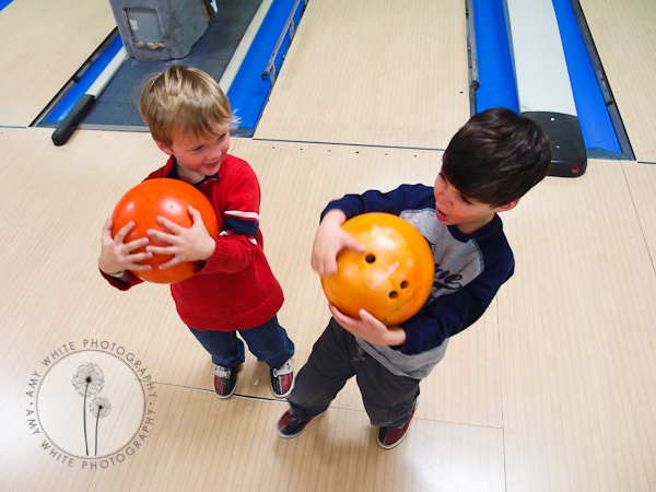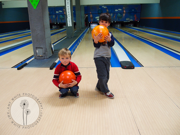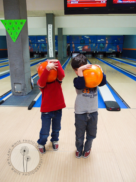 On Friday my friend Danielle left her younger son at home and we took Quinn and Lucas to a local bowling alley for an afternoon of fun. It was just us and a group of old timers. The boys had so much fun throwing their big orange bowling balls down the alley. They were helped out by the gutter bumpers.