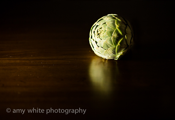 I want to critique #1 because this one really speaks to me. You have given the artichoke life and a little bit of personality — there\’s something playful about the image, like it just rolled in from the shadows. The light is fantastic, and the reflection is wonderful. I like that you have kept the \”horizon line\” (the foundation on which the artichoke rests) above the halfway point. I wonder about the top edge placement, though — what was behind that decision? I\’d have been inclined to place this one lower, though I see an argument for the upper placement suggesting a little more movement. For comparison\’s sake, here is the lower placement: