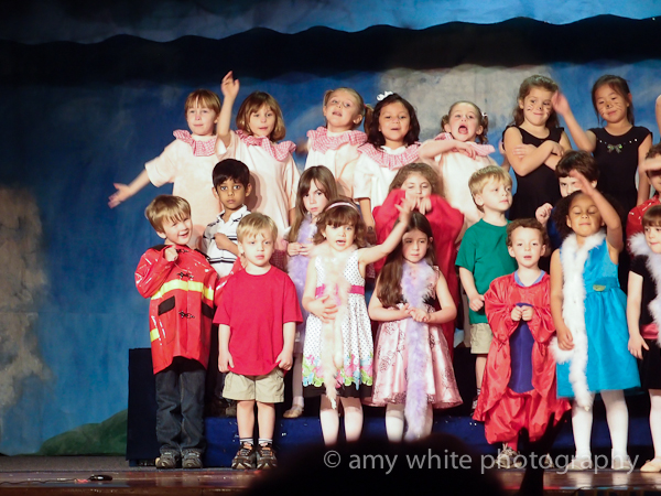 Quinn\’s class is grouped together on the first two rows on the left….from Quinn on the end to the little girl with the black dress, pink bow, and white boa and the boy in the red behind her. One of Quinn\’s favorite new playmates is the little girl with the blue dress and white boa. I think they are the two tallest in the class (she may even be taller (and younger) than Q!).