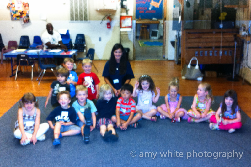 His class consists of all returning Sundance students — there are 5 kids from his class last year and one from his class the year before (the little blondie on Q\’s left). He also has another set of twins in his class this year (the two behind Q in the bright red and blue shirt). And that\’s Mr. Daniel in the back that does all the sport stuff with the kids.