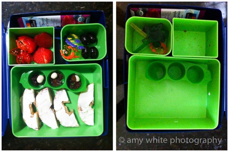 On Wednesday he got a mini-bagel with cream cheese, raisins and a couple of yogurt covered raisins, strawberries, olives, and a dried fruit strip. And you can see how he did with his lunch. I asked him if there were any animals in his lunch and he remembered all the little food picks. But like I said, ask me again at the end of the year.