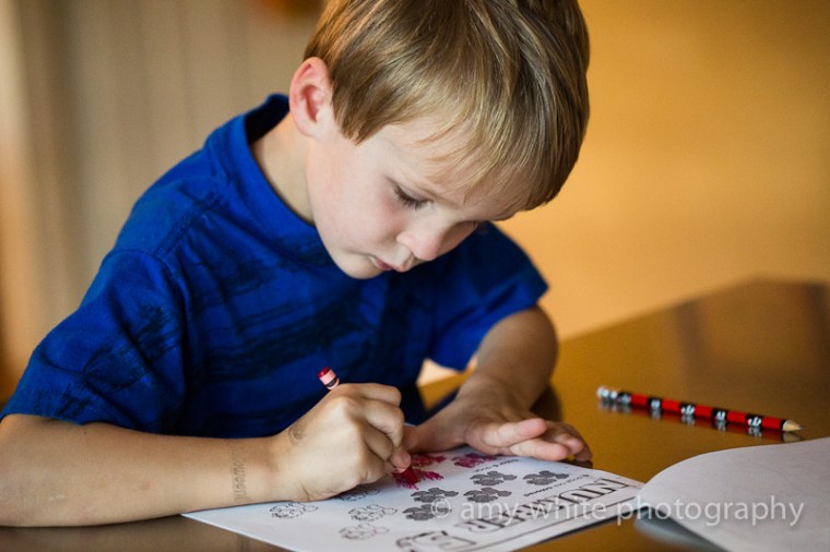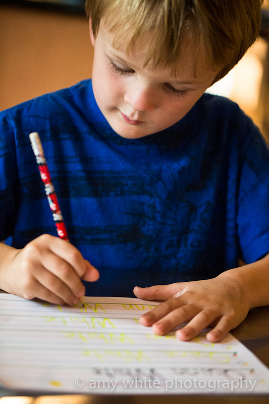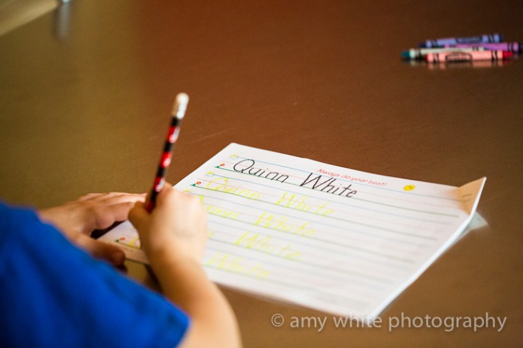 Every Monday Quinn brings home a reinforcement pack from school. It\’s 3 – 4 pages of exercises related to what they are working on that week. Each week the pack starts with a page to trace their full name 4 times using both upper and lower case letters. In theory we should do a little bit each day but usually Thursday rolls around and we sit down and do it all in one sitting. Quinn has been very agreeable and fully engaged.