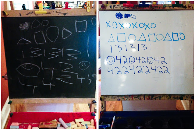 Since starting school this year, Quinn\’s brain seems to constantly be on overdrive mode. A typical conversation in the car with him goes like this: What\’s 2 + 1? What\’s 10 + 10? How do you spell pig? What does that sign say? Is orange, orange, orange, orange a pattern? etc, etc. It\’s great to see him so engaged and enthusiastic about learning. Yesterday he suggested playing a pattern game. He would draw a pattern and I would repeat it and visa versa.