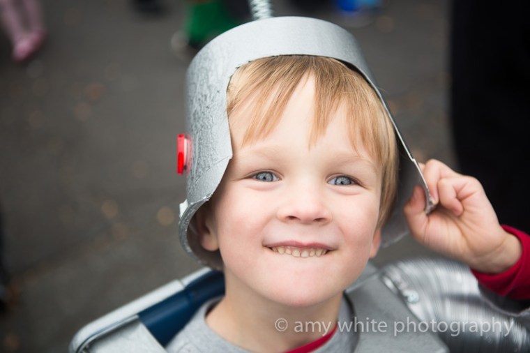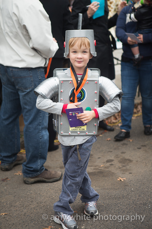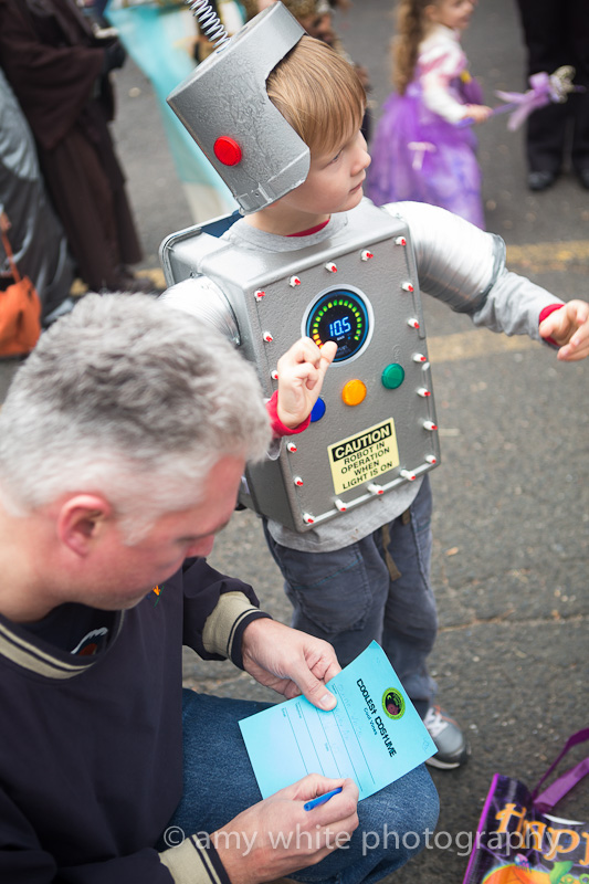 At 2:30 everyone gathered on the closed street and judges walked around handing out awards. Quinn got a \”Coolest Costume\” award for his robot costume. Yes, we pulled out the robot costume in hopes of an award. About 50 other kids got the same award but that is a-ok.
