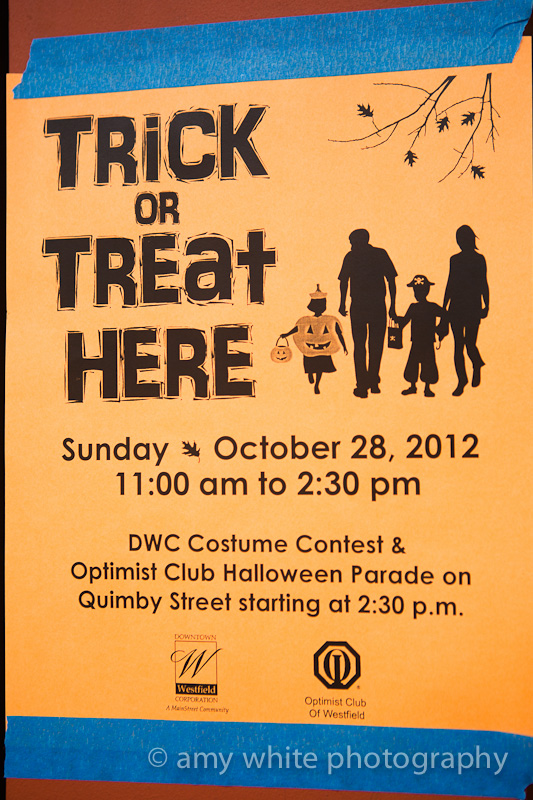 On Sunday we participated in Westfield\’s Halloween activities, along with every other family in Westfield. With the impending storm I think everyone decided to get in some trick or treating on Sunday because this may be the only chance. Most of the businesses participate in handing out candy to the kids and then there is a costume parade with the Westfield High School Marching Band leading the way.