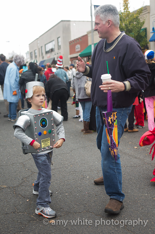 At 2:30 everyone gathered on the closed street and judges walked around handing out awards. Quinn got a \”Coolest Costume\” award for his robot costume. Yes, we pulled out the robot costume in hopes of an award. About 50 other kids got the same award but that is a-ok.