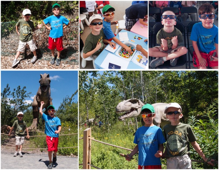 On Wednesday Don took both boys to the Field Station Dinosaur Exhibit by himself. I sent him along with the camera. When I asked if he got any good pictures Don said that the boys were making faces in all the pictures. Yep, they are. But you can also tell how much fun they are having.