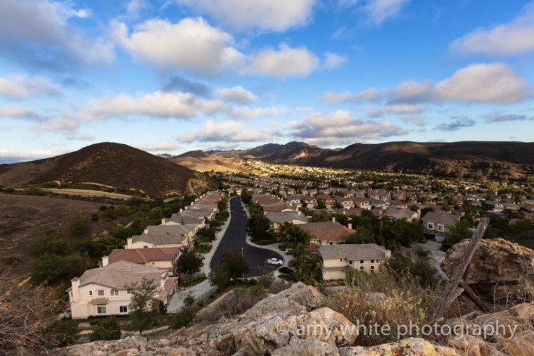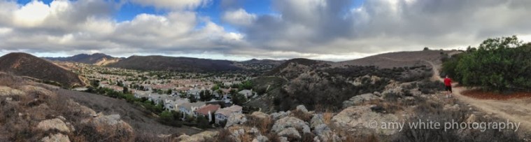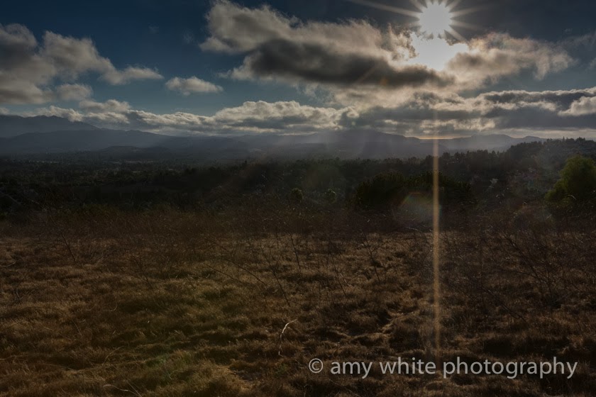 If you continue on the trail the other side of the hill looks out over Thousand Oaks and beyond. It seems impossible but I think that might be the ocean in the far distance glowing yellow. The one long streak of sunlight is going right through the middle of it. I will have to return for sunset!