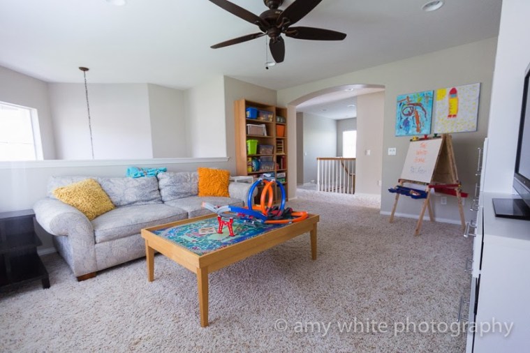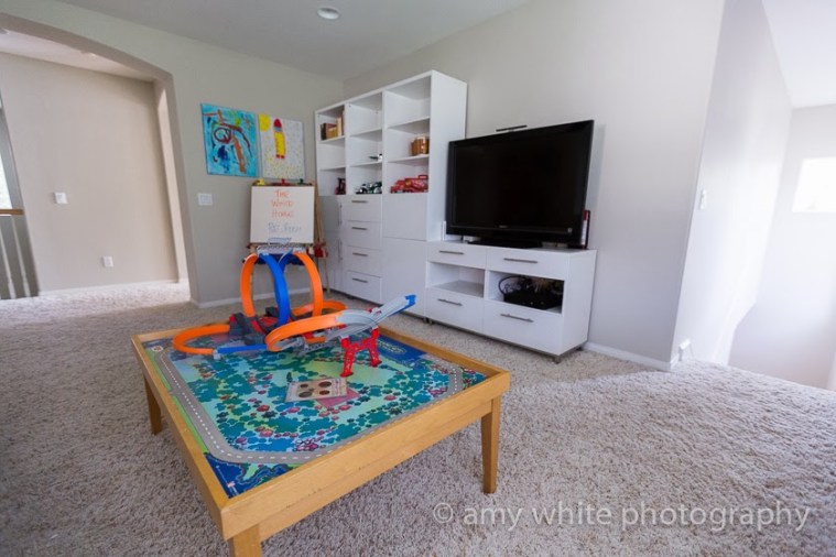 It\’s nice to have one more room unpacked and just about finished. Our new house has an open area on the 2nd floor between the master bedroom and the other 2 bedrooms. We decided to make it our family rec room with a TV, wii, games, toys, etc. A place for us to hang out as a family and for Quinn to hang out with his friends.