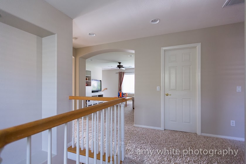 Ready to see the new and we think much improved room? You can see how open it is as you come up the main stairs. And the new brighter, light paint. Master bedroom to the left and 2 other bedrooms to the right.