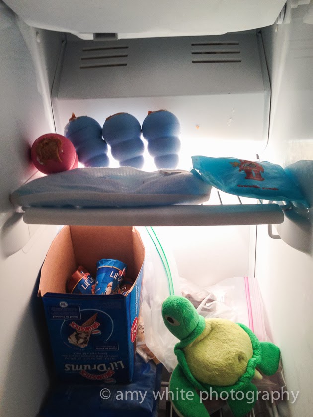 We\’ve learned to keep a stash of Kong\’s in our freezer filled with wet dog food, cottage cheese, peanut butter, etc to give to Sonic when he goes in his crate or when we want some peace and quiet. He loves these and they will keep him occupied for a good amount of time.