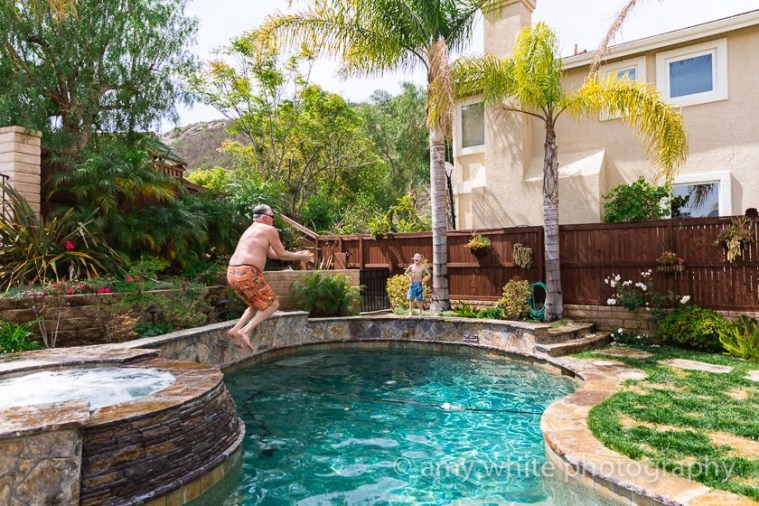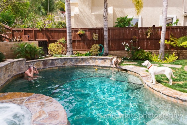 A beautiful afternoon in SoCal but the pool is still chilly. Don and Sonic were the only two crazy enough to jump in. Don got the hot tub going to warm up between chilly dips.