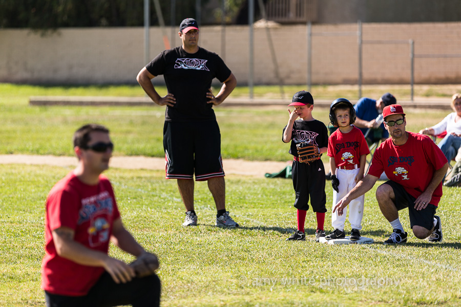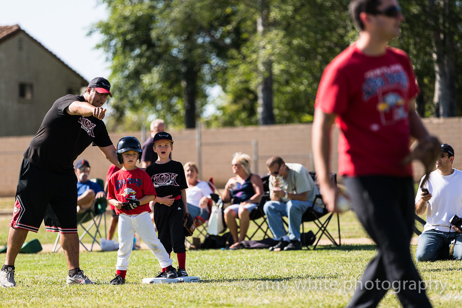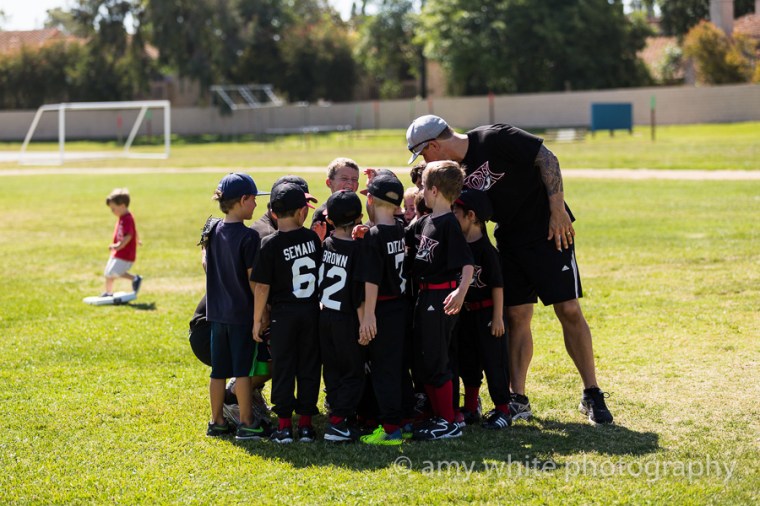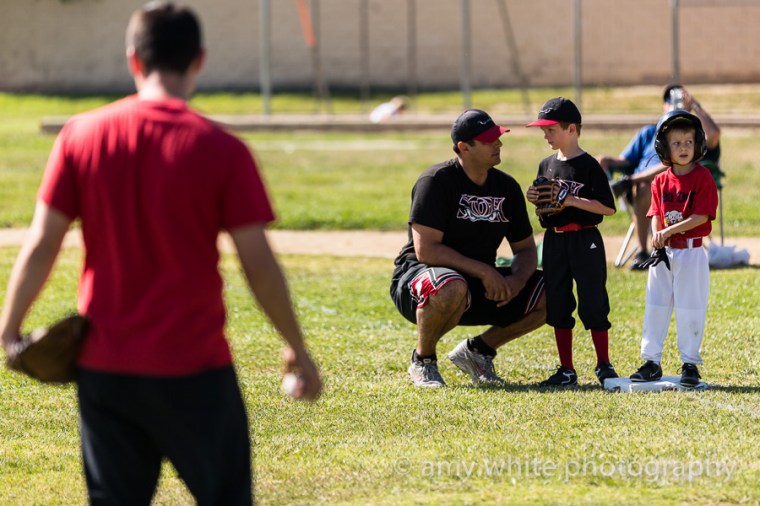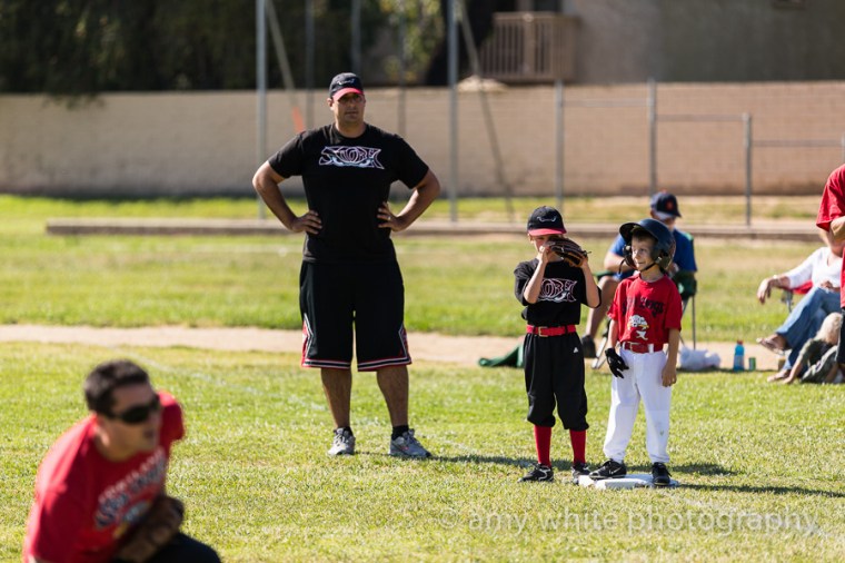 Quinn wasn\’t really paying attention to the game and a teammate threw the ball to him and it hit him right in the chest. Coach Mike is giving him a pep talk.