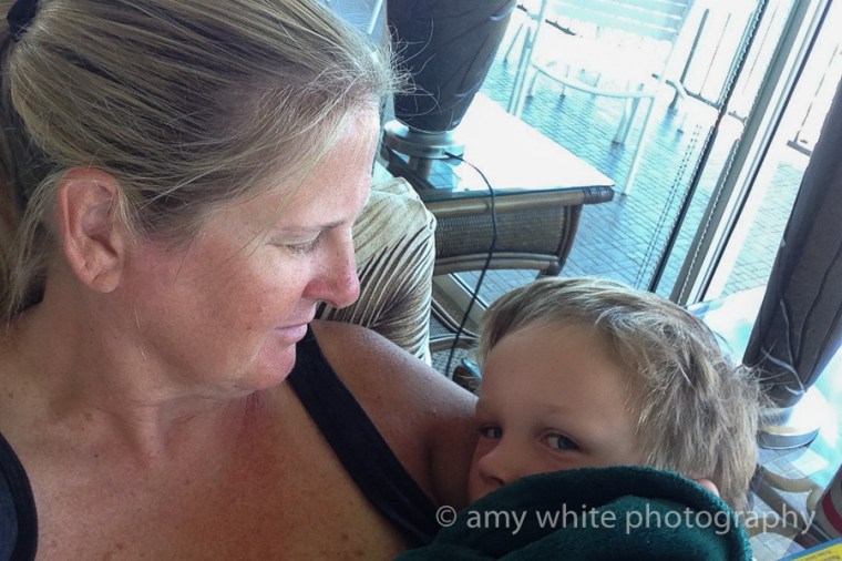 Morning routines don\’t change because of the location. Green blankie and snuggles with mama.