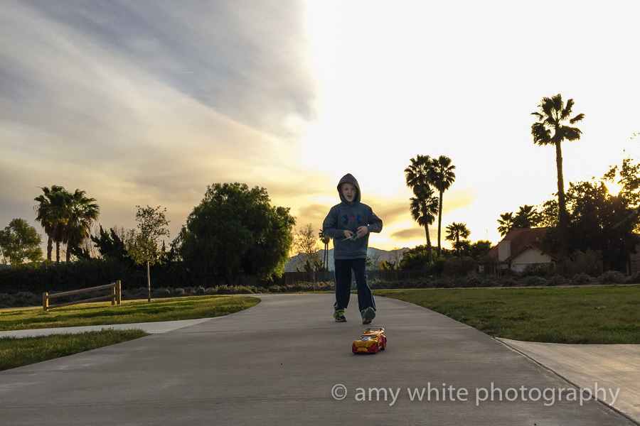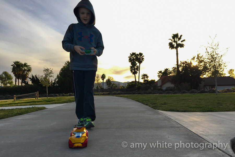 On Thursday Quinn and I made a late trip to the park so he could race his R/C car. He took this car all the way around the park . The dogs especially loved him 🙂