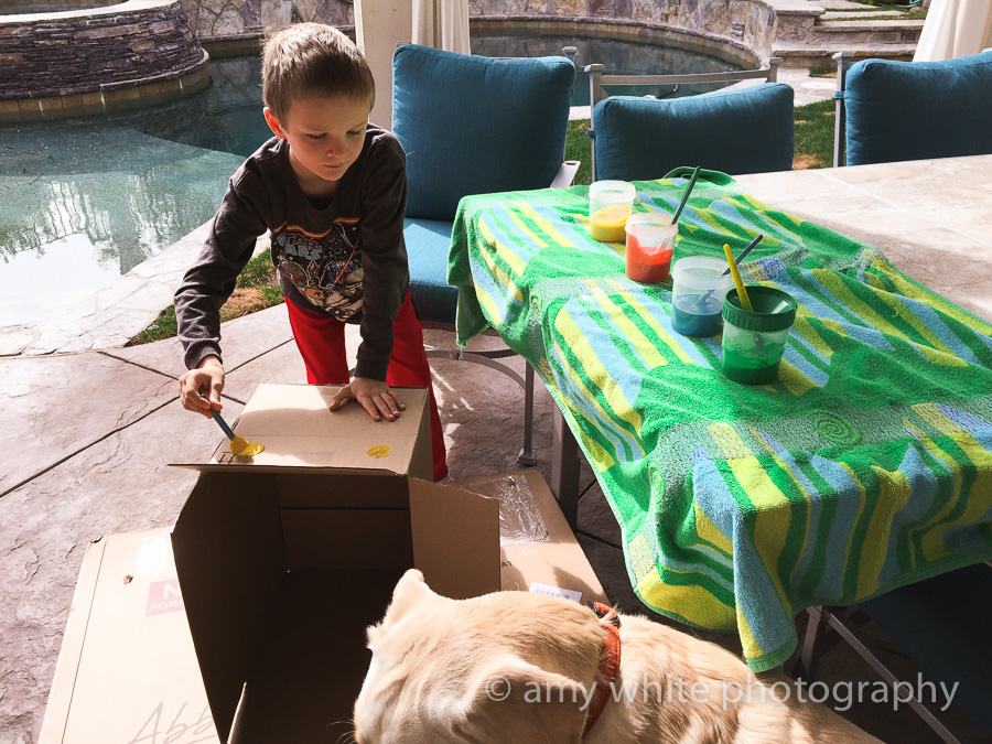 Or maybe not. He\’s sick but still has quite a bit of energy. This project reminded me of the good old days when Quinn would paint at his easel on Ripley Ave. He\’s making a snowmobile.