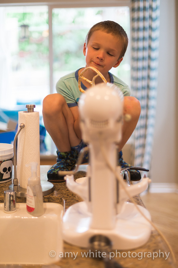 We baked some chocolate chip cookies. He pretended he was interested but really was just waiting for the paddle.
