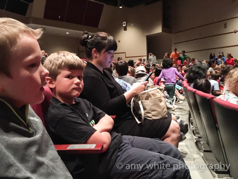 Quinn and Zach waiting for the performance to start. The performance was fun and silly and kept the kids entertained.
