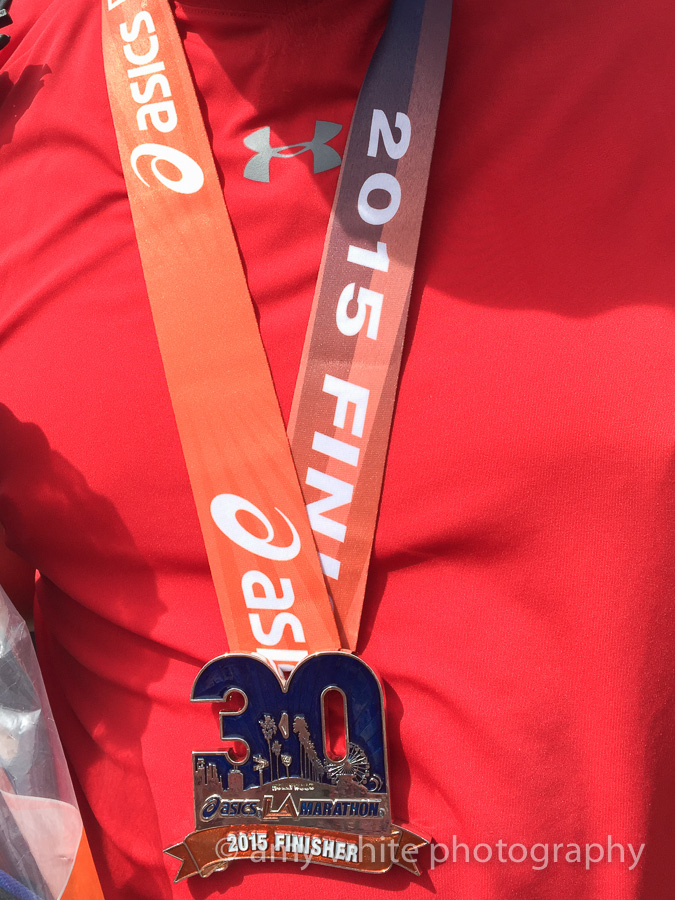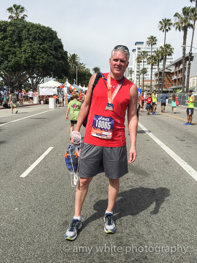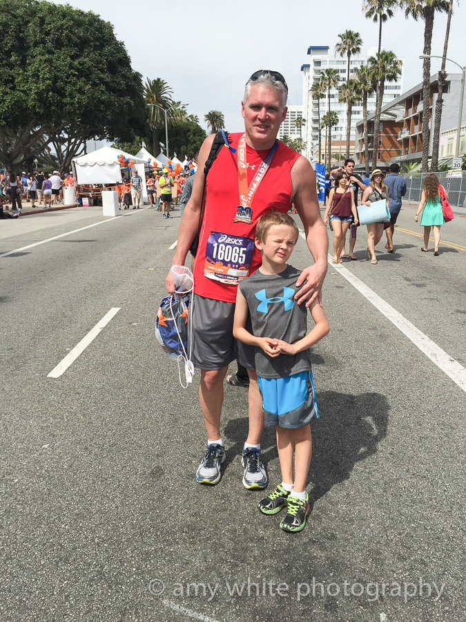 Unfortunately we weren\’t able to see him running or finish because it was crazy crowded. It was my first marathon as a spectator so I wasn\’t quite sure where to go or watch. It took about 30 minutes after he finished to make his way to where it wasn\’t so crowded that we could find him. But there was an LA Marathon iphone app (of course) so we were able to track his time splits at every 10K and see when he finished.