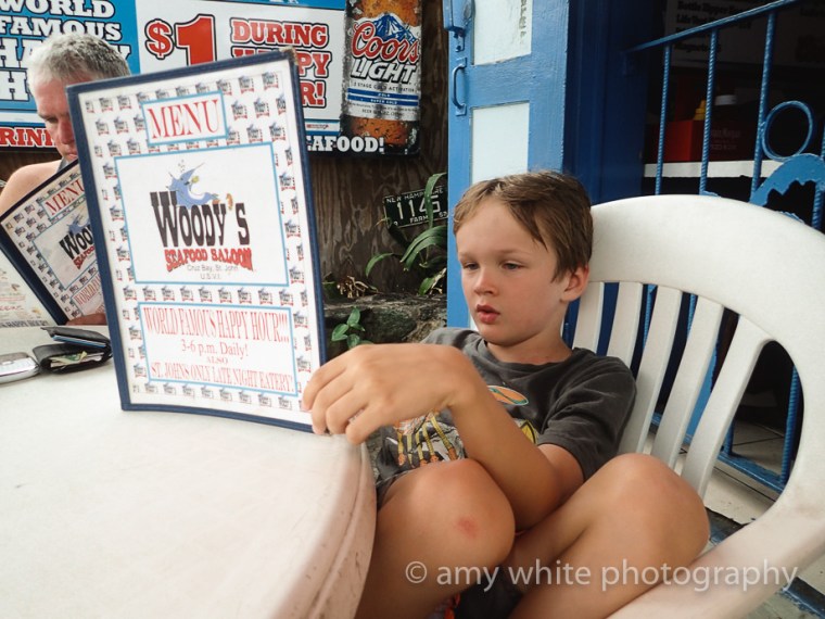 The rain was not stopping so we headed to Cruz Bay for lunch. Woody\’s is a favorite hangout for the younger generation during happy hour but a perfect spot for us oldies at lunch.